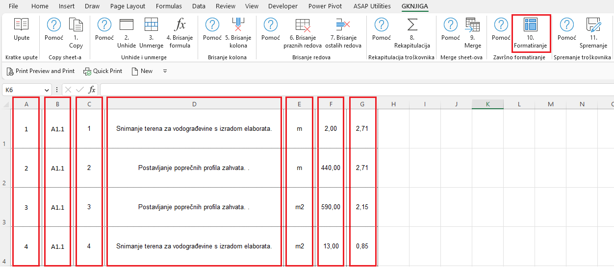 Kolona A: redni broj stavaka - korištenjem opcije 10. Formatiranje modul automatski dodaje kolonu - obavezna kolona
